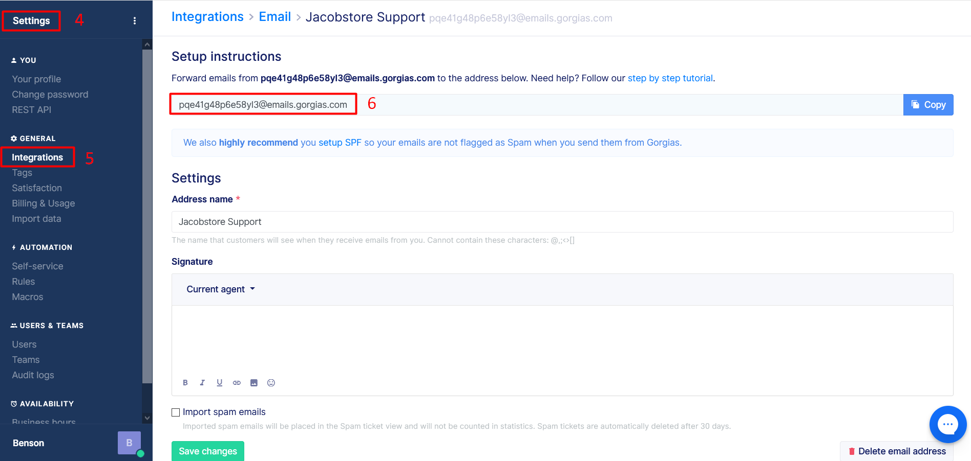 Step 6 – From the newly opened pane, copy the Gorgias support email address.