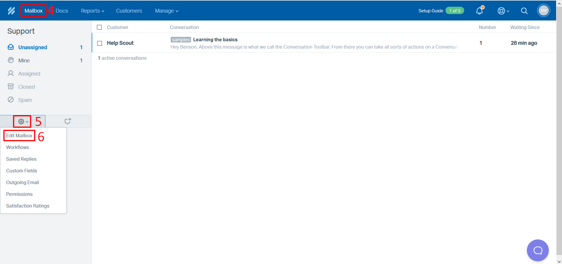 Step 4 – Login to Help Scout. Click on “Mailbox” on the left side top corner.